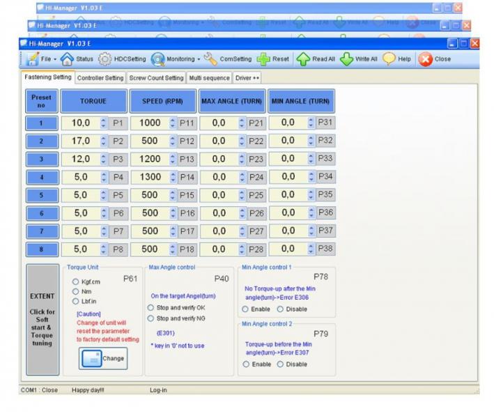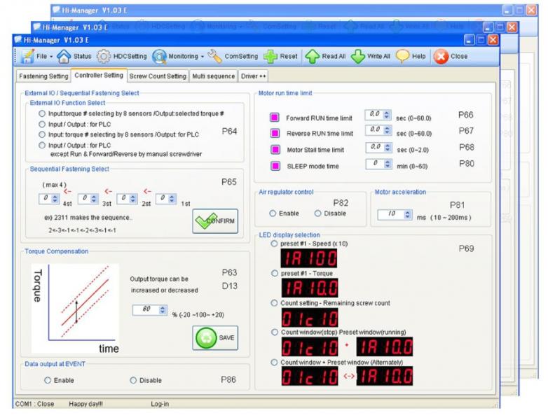 Parametri za rukovanje: okretni moment, brzina, kut, meki start, okretni moment tunning u 8 unaprijed pohranjenih programa, USB priključak za PC komunikacije ili "firmware" nadogradnju, prikaz pogreške, komunikacija i uzorak pogreške skupine, "inside chip" za pohranu podataka alata i prepoznavnje alata, ESD uzemljenje.